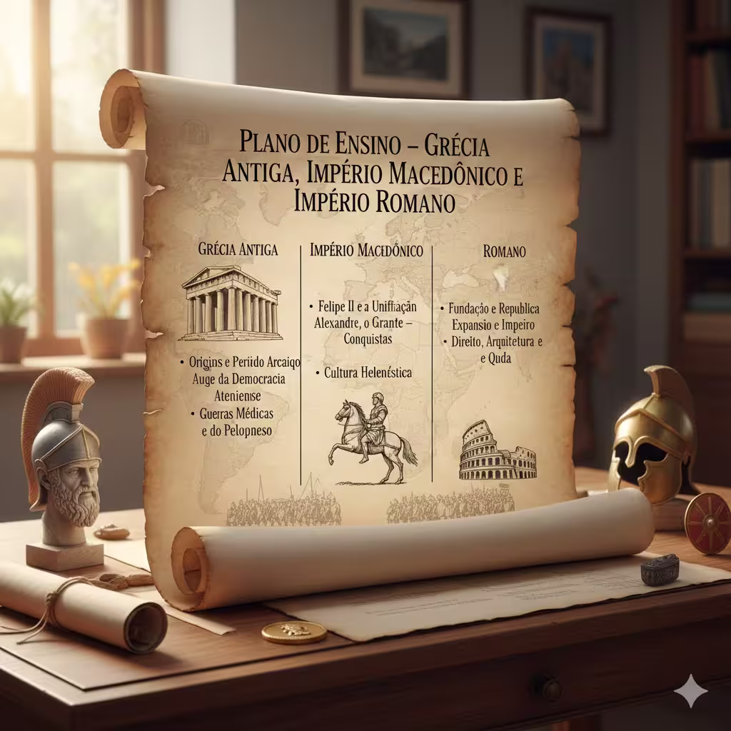 - Semanas 1–4: Grécia Antiga (polis, Atenas/Esparta, cidadania, cultura).